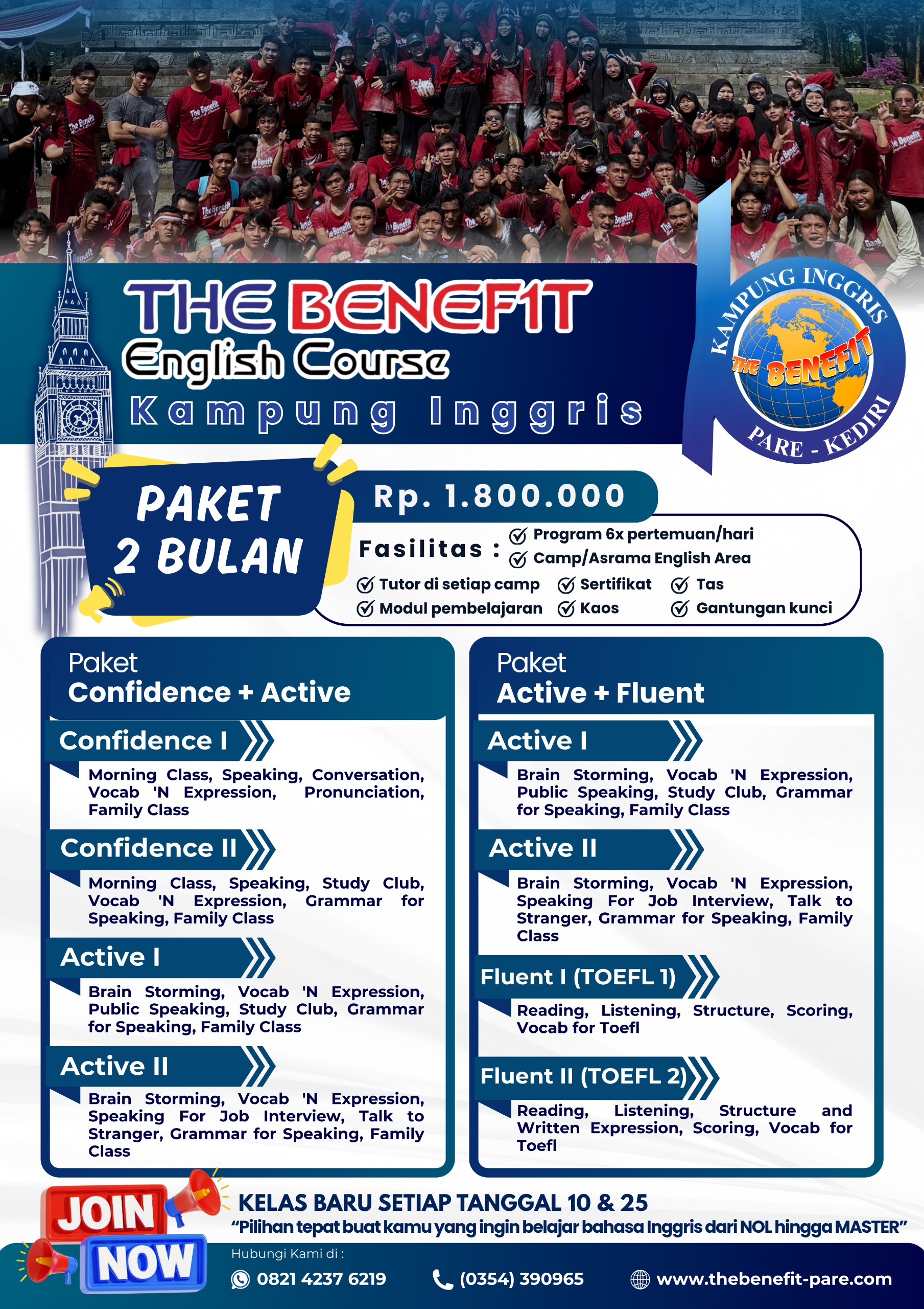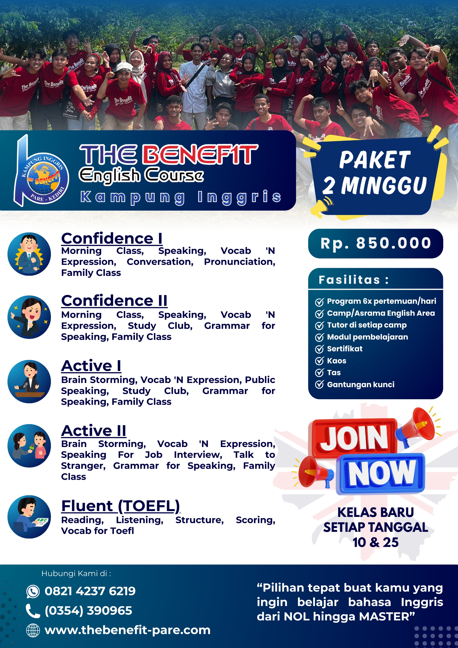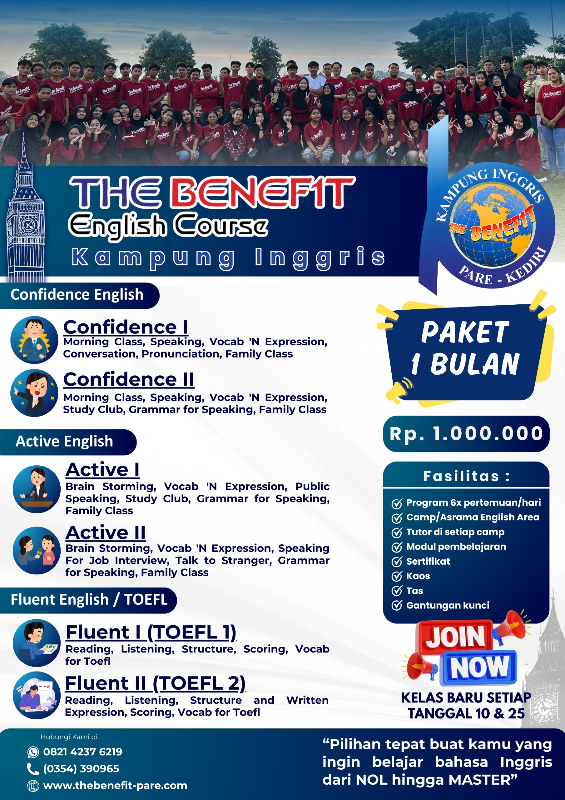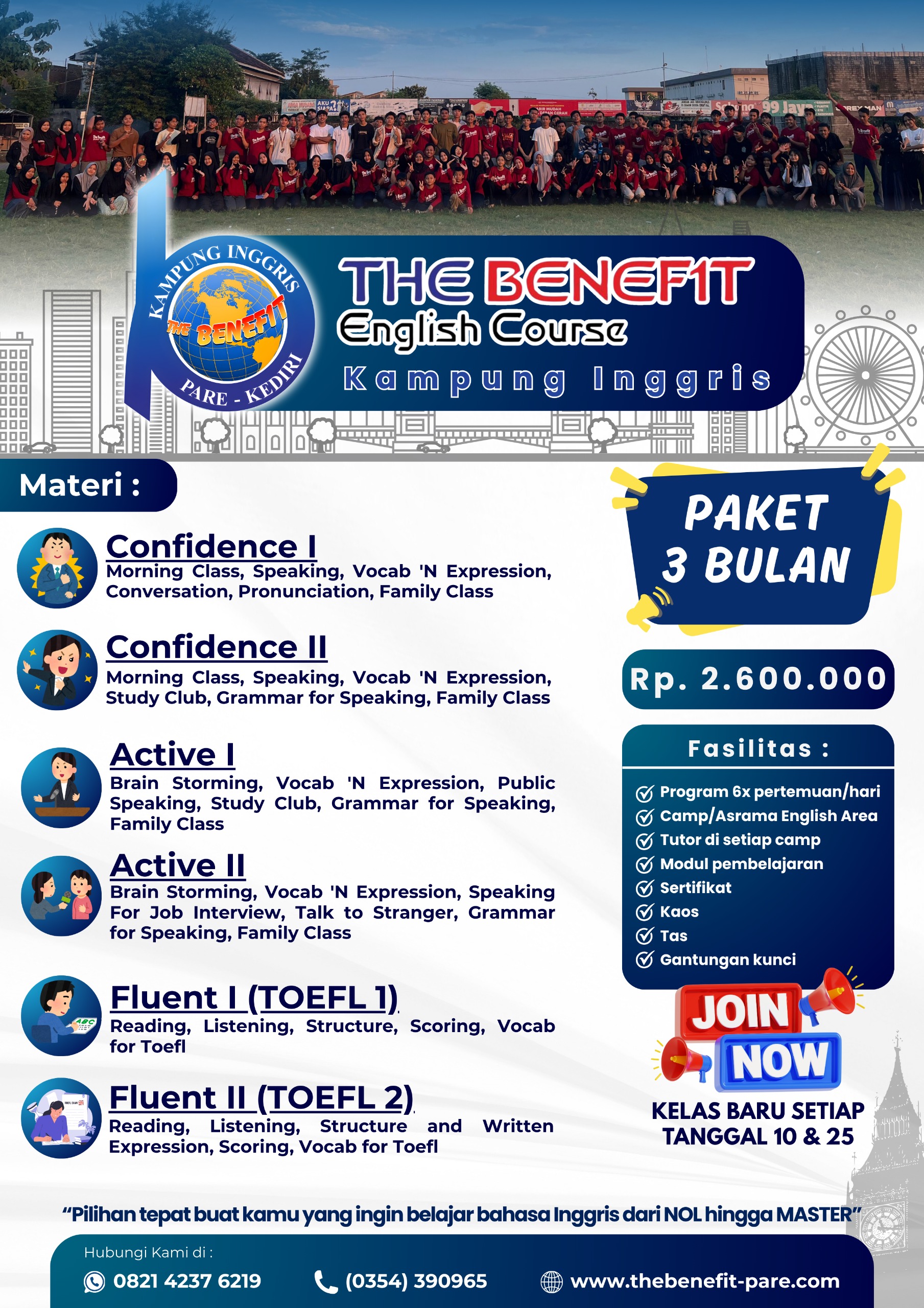 The Benefit merupakan lembaga kursus Bahasa Inggris yang di desain khusus buat kamu yang mau belajar bahasa Inggris mulai dari tahap dasar hingga master karna visi kami adalah "FROM ZERO TO BE MASTER". Program komplit yang sudah terkemas dalam 1 paket mulai dari basic hingga speaking for job interview, public speaking, Grammar basic s.d tingkat tinggi, TOEFL s.d MICRO TEACHING dapat kamu kuasai dari English-mu yang basic hingga kamu Master hanya dalam rentang waktu 3 - 6 bulan dengan garansi uang kembali jika kamu gagal speak English dengan lancar. Tentunya ini suatu tolak ukur bahwa join dalam program ini sangat tipis kemungkinan kamu untuk gagal.