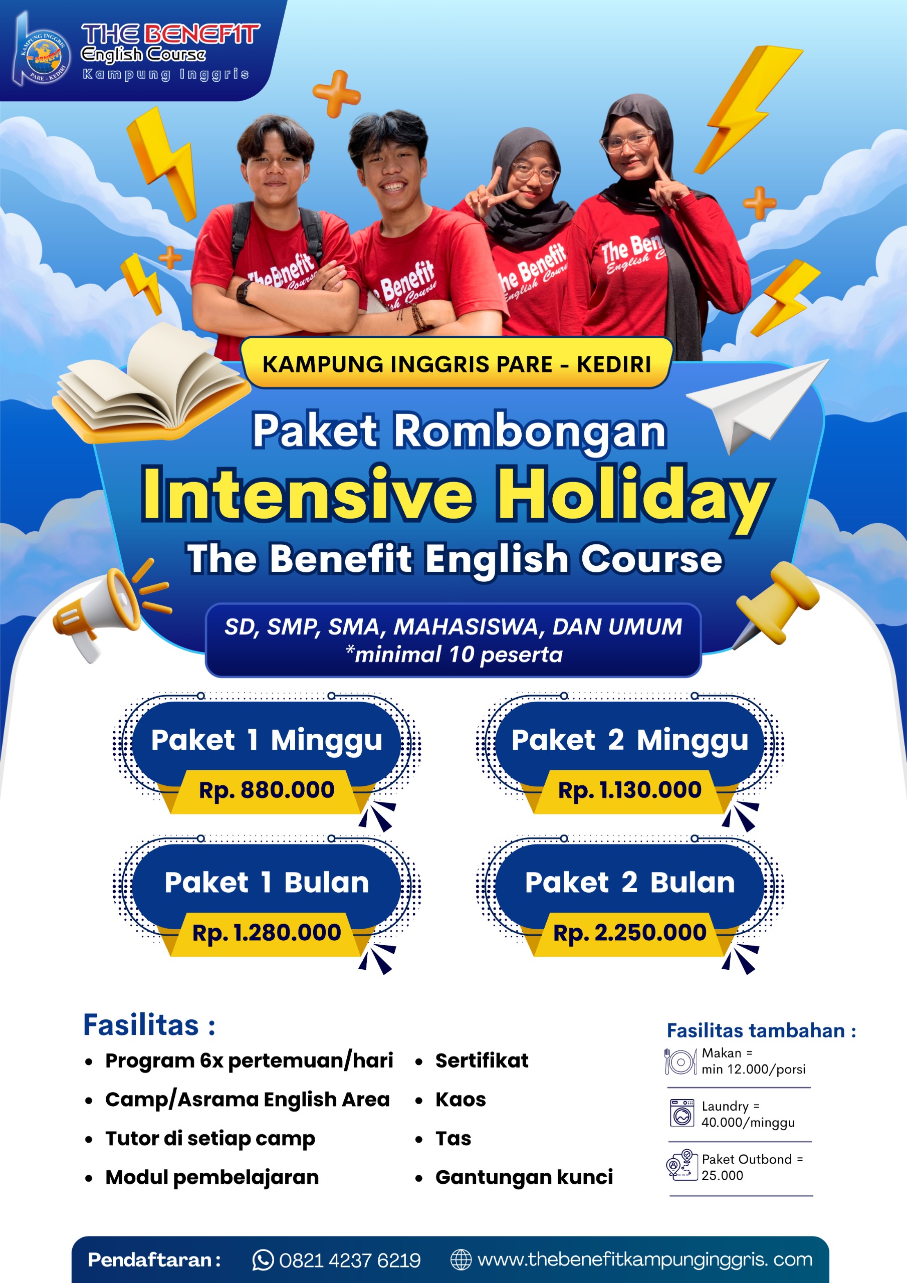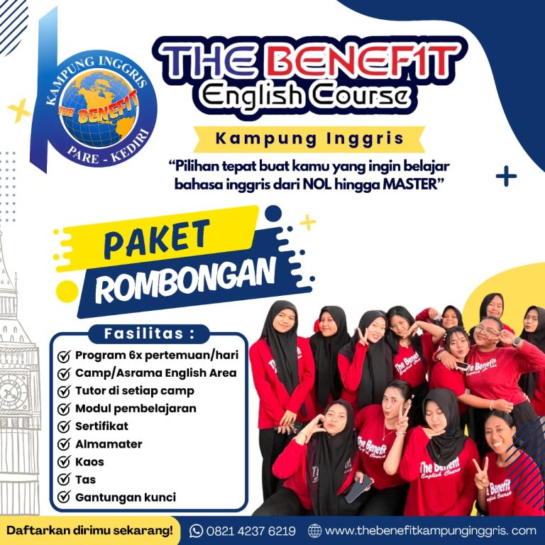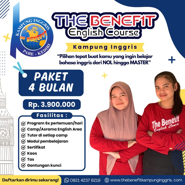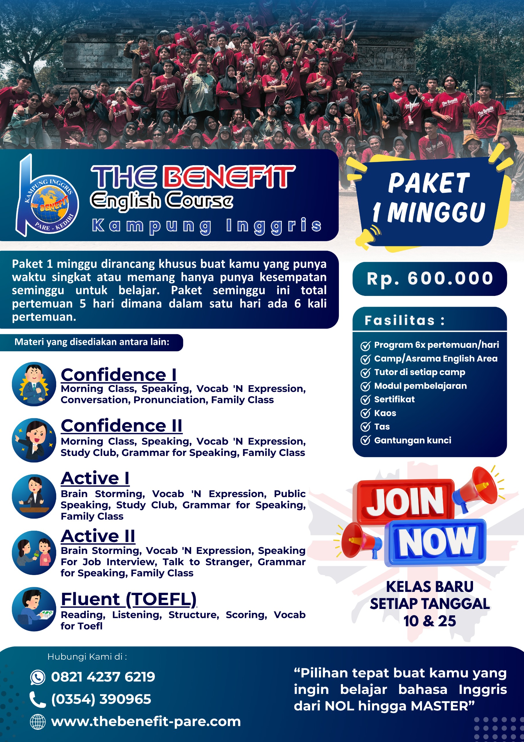 The Benefit merupakan lembaga kursus Bahasa Inggris yang di desain khusus buat kamu yang mau belajar bahasa Inggris mulai dari tahap dasar hingga master karna visi kami adalah "FROM ZERO TO BE MASTER". Program komplit yang sudah terkemas dalam 1 paket mulai dari basic hingga speaking for job interview, public speaking, Grammar basic s.d tingkat tinggi, TOEFL s.d MICRO TEACHING dapat kamu kuasai dari English-mu yang basic hingga kamu Master hanya dalam rentang waktu 3 - 6 bulan dengan garansi uang kembali jika kamu gagal speak English dengan lancar. Tentunya ini suatu tolak ukur bahwa join dalam program ini sangat tipis kemungkinan kamu untuk gagal.
